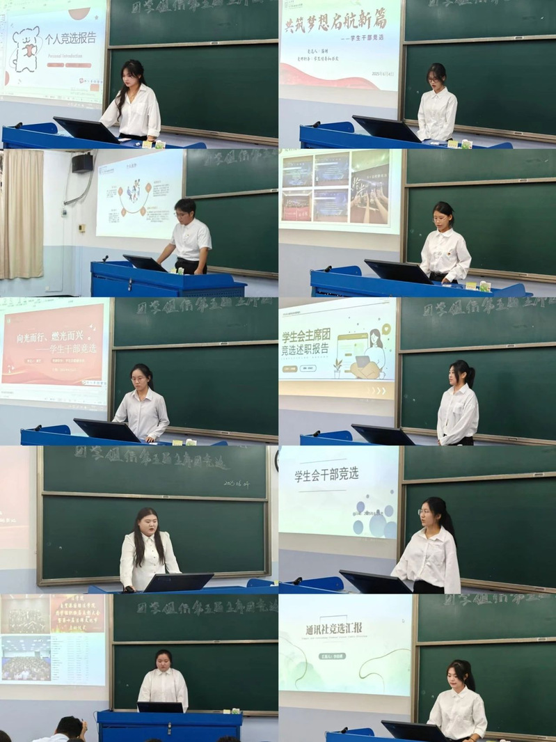 竞选人依次登台,结合PPT详细阐述个人工作成果及未来规划,围绕活动组织、团队协作等实际任务进行述职汇报。各位评委针对竞选人履职经历及工作设想展开提问,竞选人沉着应对,灵活作答,展现出扎实的业务素养与清晰的执行思路。