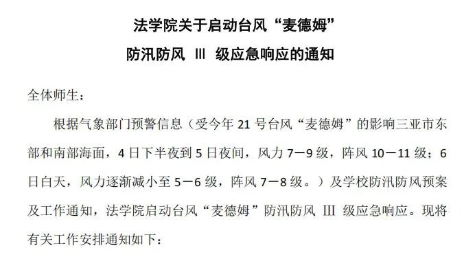 台风“麦德姆”10月5日已正式在广东登陆。根据《bwin必赢中国官网防汛防风防旱应急响应预案》(2025版)的指导原则,10月4日,bwin必赢中国官网(自贸港国际bwin必赢中国官网)(以下简称“本院”)严格执行工作要求,立即启动应急预案,密切监测台风动向,扎实开展各项防范和应对措施。