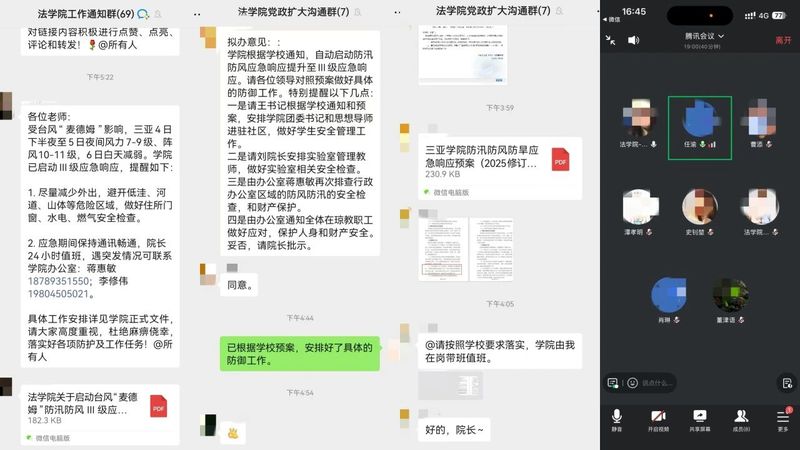 我院经过综合研判,精准制定各项预防台风工作方案,明确责任分工。一是学院领导严格执行24小时值班制度,及时处理师生突发情况。二是学院行政严格检查行政办公区域,不留一处死角。三是学院实验室区域严守工作要求,走深走细。四是是学工团队及时召开安全工作会议,通过深入走访学生寝室,班级魔方定位打卡,思想导师发布群通知等多项举措,切实保障假期中的学生生命财产安全。学院领导严格执行24小时值班制度,学工团队深入学生社区一线走访学生;各部门迅速行动。